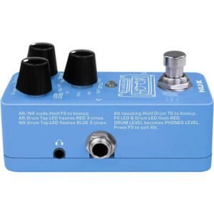 The Nu-X Hook Drum & Loop pedal, aka NDL-3, is a very good small footprint mini-pedal with an integrated beat-sensing drum machine that can add quite a lot to your looping experience. What this does is detect the tempo you play into your first loop recording. It then can add a drum pattern at an appropriate tempo to your project. Alternatively you can use a tap tempo button to input a tempo, then start your drum pattern to play along to. Also available is Auto-record, which will allow you to arm the pedal for recording, but it will wait for you to start playing before automatically starting the loop record. To set the pedal to Auto-record, you have to hold the pedal switch down while powering it up. The colour of the Drum Tap Indicator LED lights either Red or Blue to indicate whether you’ve started in Normal Recording or Auto Recording Mode. NDL-3 pedal offers 11 different Drum beat styles and rhythms for you to work with.