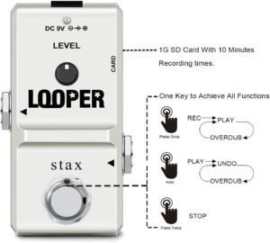 Here’s a simple little Looper pedal from Stax that offers up to 10 minutes of 48Khz, 24Bit recording, Undo/Redo/Delete functions, unlimited overdub layering and comes with a 1Gb Micro SD card, but does not come with a power adapter, so you’ll need to power it up on your own with standard 9v center-N power. Everything is controlled thru it’s single footswitch, and there is a volume knob for output level. That’s it !
